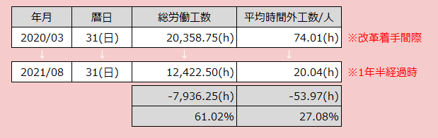 直近2021年8月の「平均時間外工数/人」は、まだまだ部門間格差が内在しています。